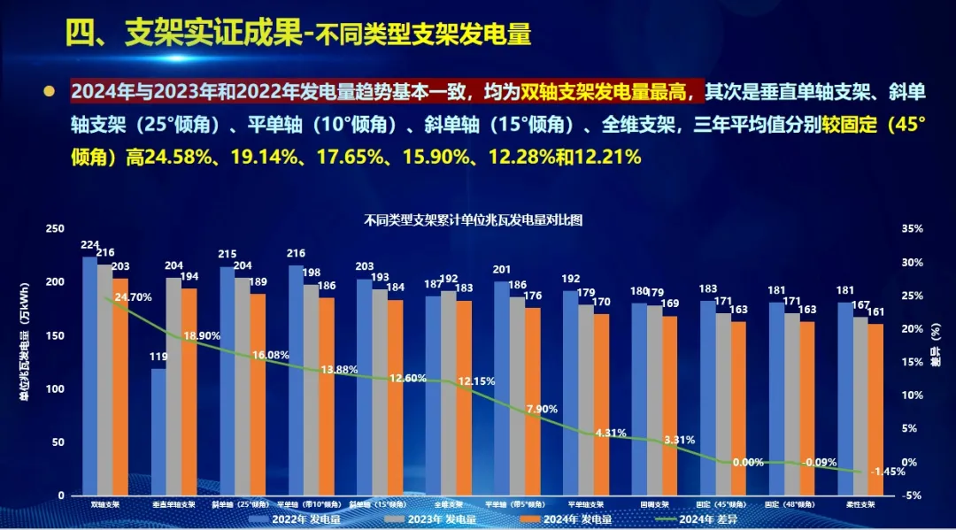 本次報告發布的是大慶基地第三個完整年度的數據采集與分析成果,同步對比2022年及2023年運行數據展開分析解讀。支架部分實證結果顯示,三年發電量趨勢基本一致,均為雙軸支架發電量最高,其次是垂直單軸支架、斜單軸支架(25°傾角)、平單軸(10°傾角)、斜單軸(15°傾角)、全維支架,三年平均值分別較固定支架(45°傾角)高24.58%、19.14%、17.65%、15.90%、12.28%和12.21%。