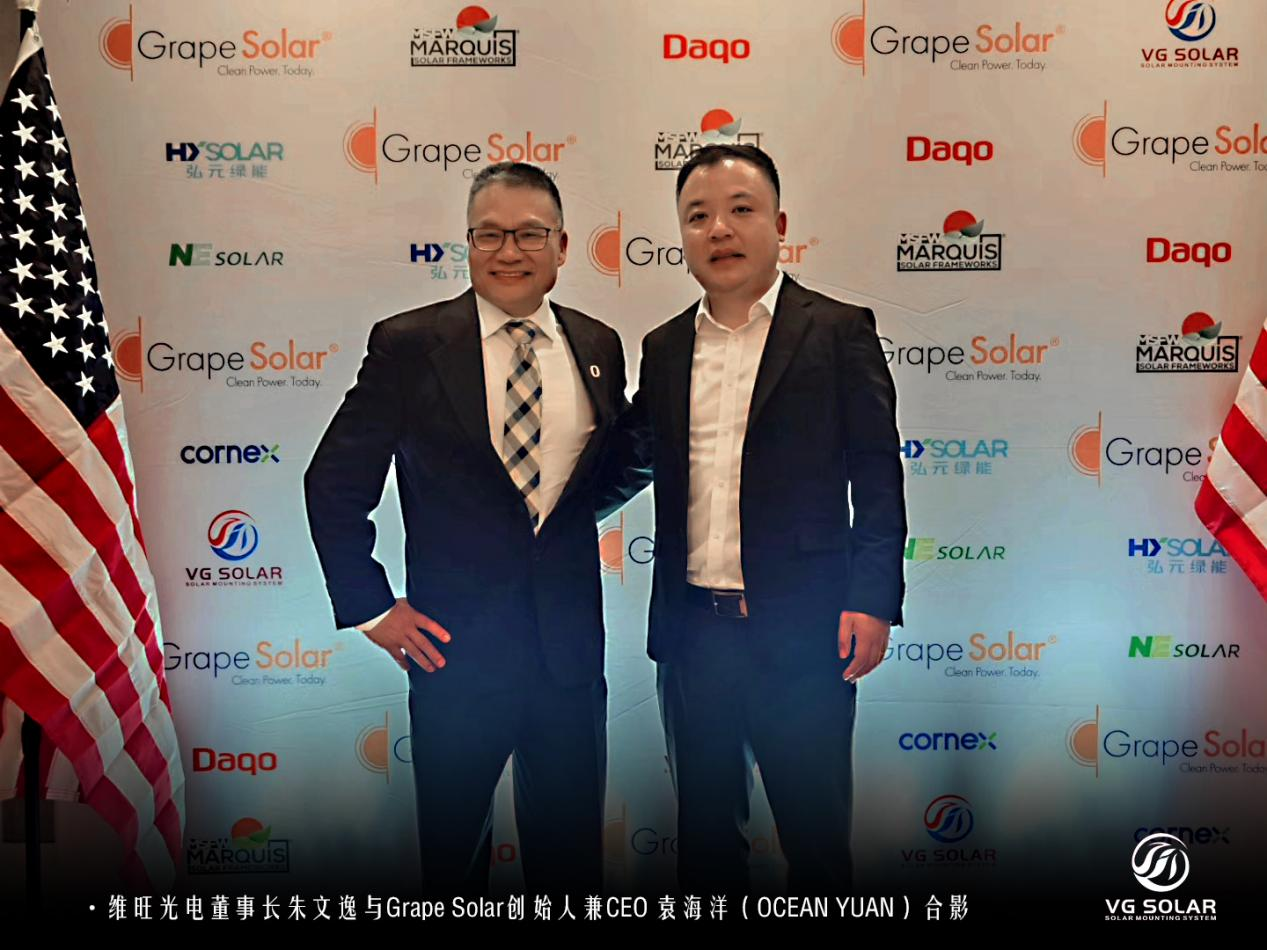 9月9日—12日,本年度美國最大光伏展會——美國國際太陽能展覽會(RE+)在加利福尼亞州阿納海姆會議中心隆重舉行。9日晚,展會同期舉辦由Grape Solar籌備的大型晚會,招待來自中美兩國光伏行業的數百位嘉賓。作為本次晚會的贊助企業之一,維旺光電(VG Solar)董事長朱文逸、副總經理葉彬儒盛裝出席,并在會上發布VG Solar Tracker,宣告維旺光電正式布局美國市場。