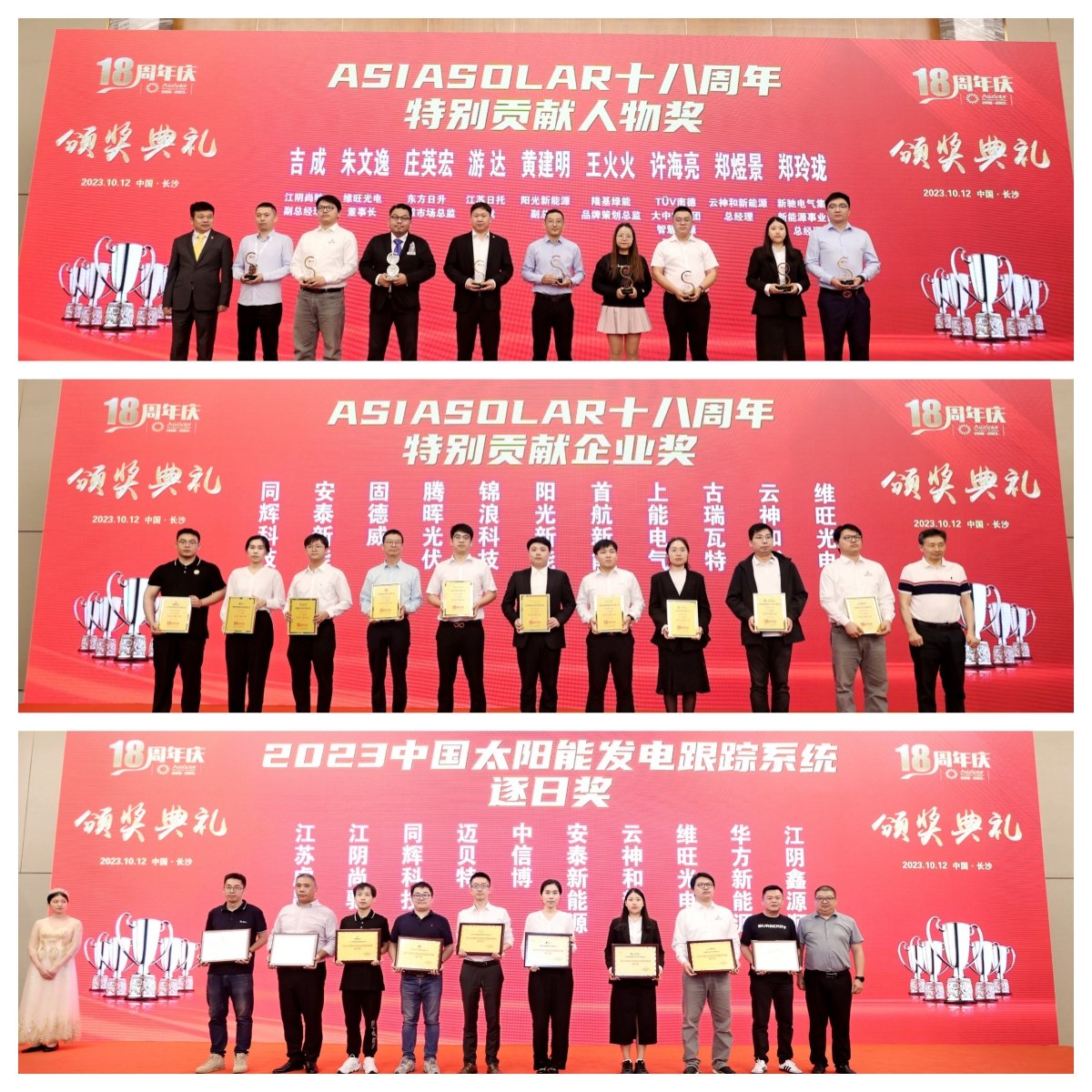 除展出的產品廣受關注外,展會首日的頒獎典禮上,維旺光電同樣表現不俗,一舉斬獲Asia Solar十八周年特別貢獻人物獎、Asia Solar十八周年特別貢獻企業獎及2023中國太陽能發電跟蹤系統逐日獎。